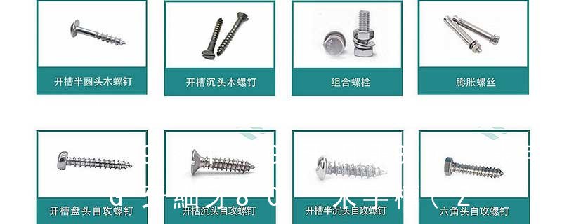 (鐵板牙自攻螺絲) B-2: Plastic Tapping Screw. (塑膠用,自攻螺絲) C: Wooden Screw : 木工螺絲 D: Drywall Screw :水泥墻螺絲 E: Self Drilling Screws鉆尾螺絲(不銹鋼鉆尾螺絲,復合材料鉆尾螺絲) F:膨脹螺絲,四片膨脹螺絲又